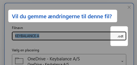 Word siger "Gem fil som Open Document .odt" ved brevfletning fra KeyBalance CRM.
