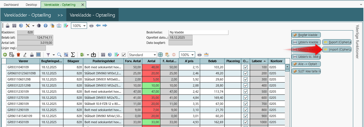 I Optællingskladden kan vi så efter optællingen på lageren med skanneren importer talene til Keybalance.