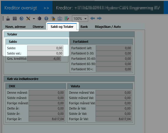 Du kan se den aktuelle saldo under fanen Saldi og Totaler inde på den enkle debitors eller kreditors kort.