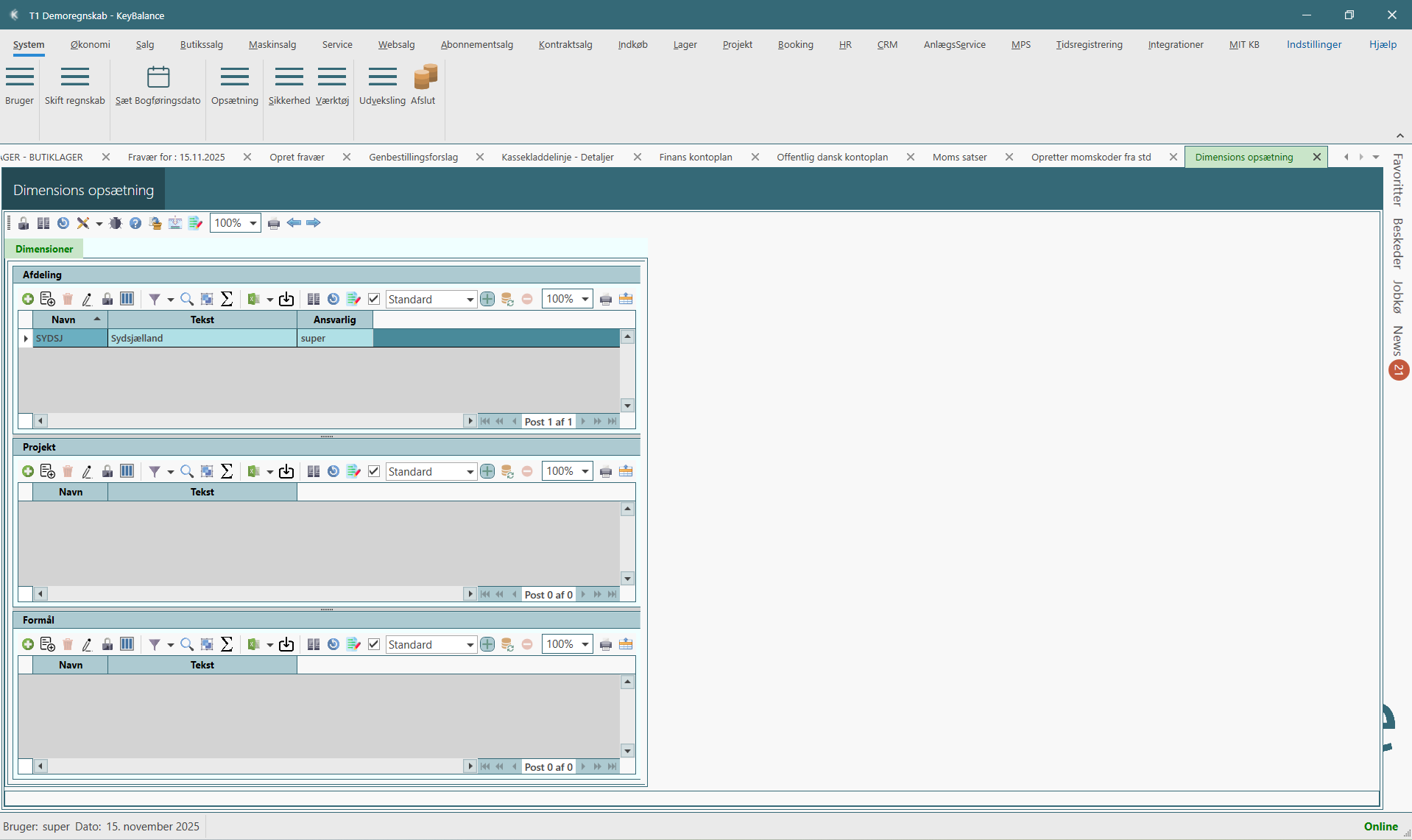 Dimensioner opsættes i System > Opsætning > Dimensionsopsætning. Du kan nemt oprette nye dimensioner ved at trykke på opret ('+', eller formularen) Der er ingen begrænsning, eller maks antal for antal af dimensioner