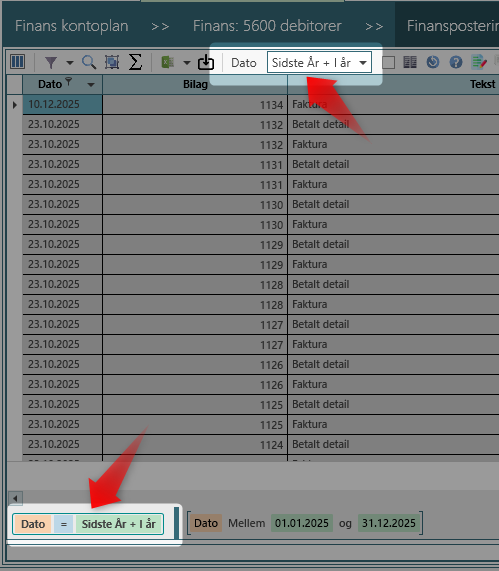 For at filtrer som i gammel klient 01.01.2025..31.12.2025 Skal man gøre følgende: