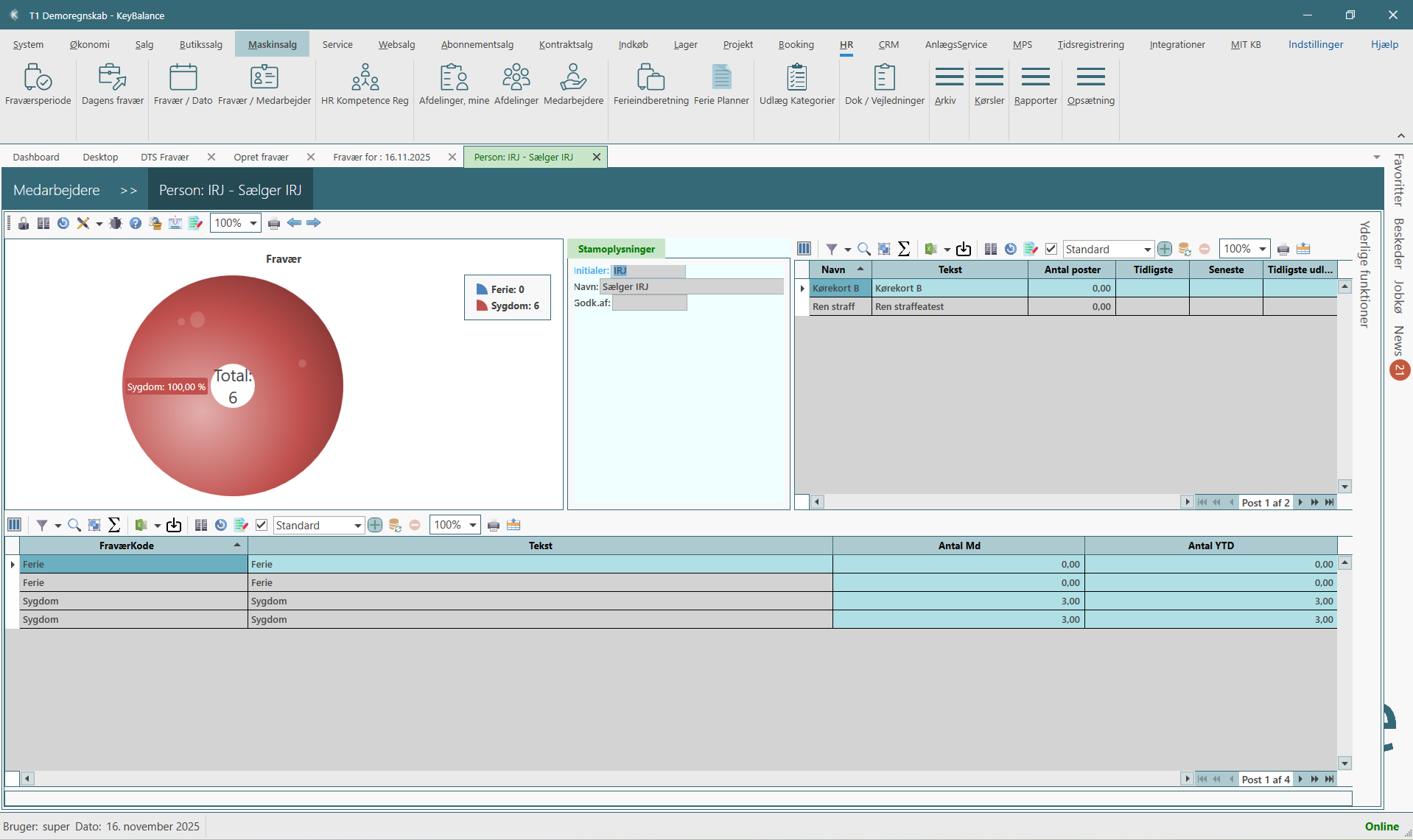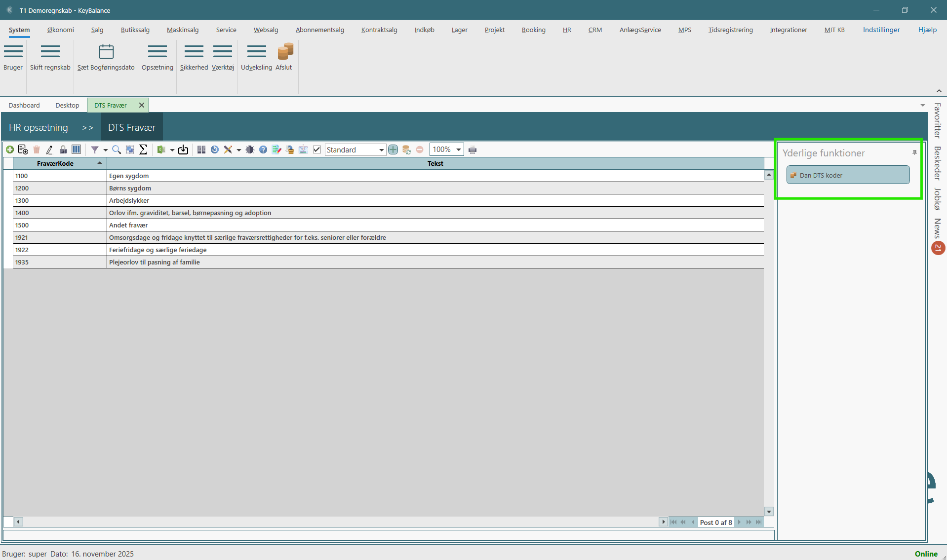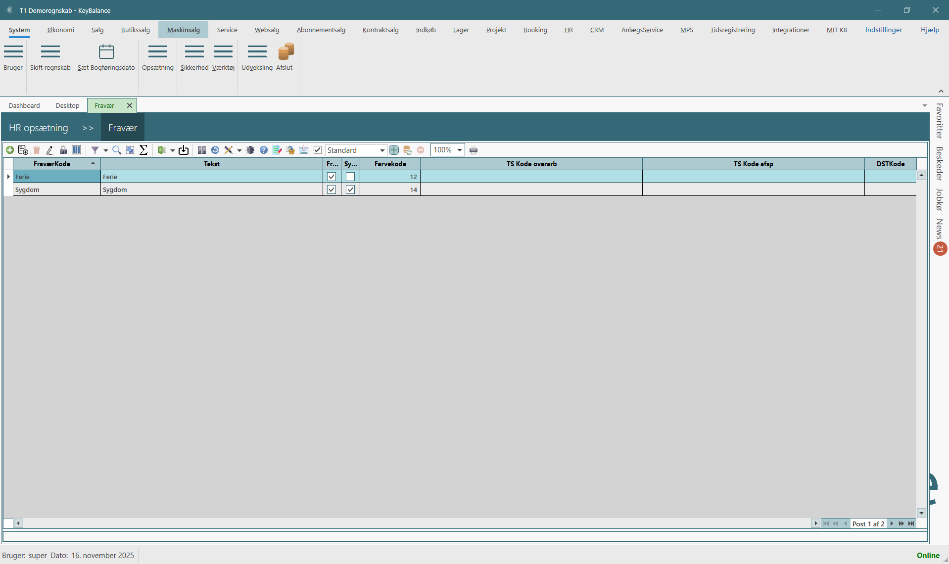 - Fraværskoder styrer automatisk lønrelationer og statistik.