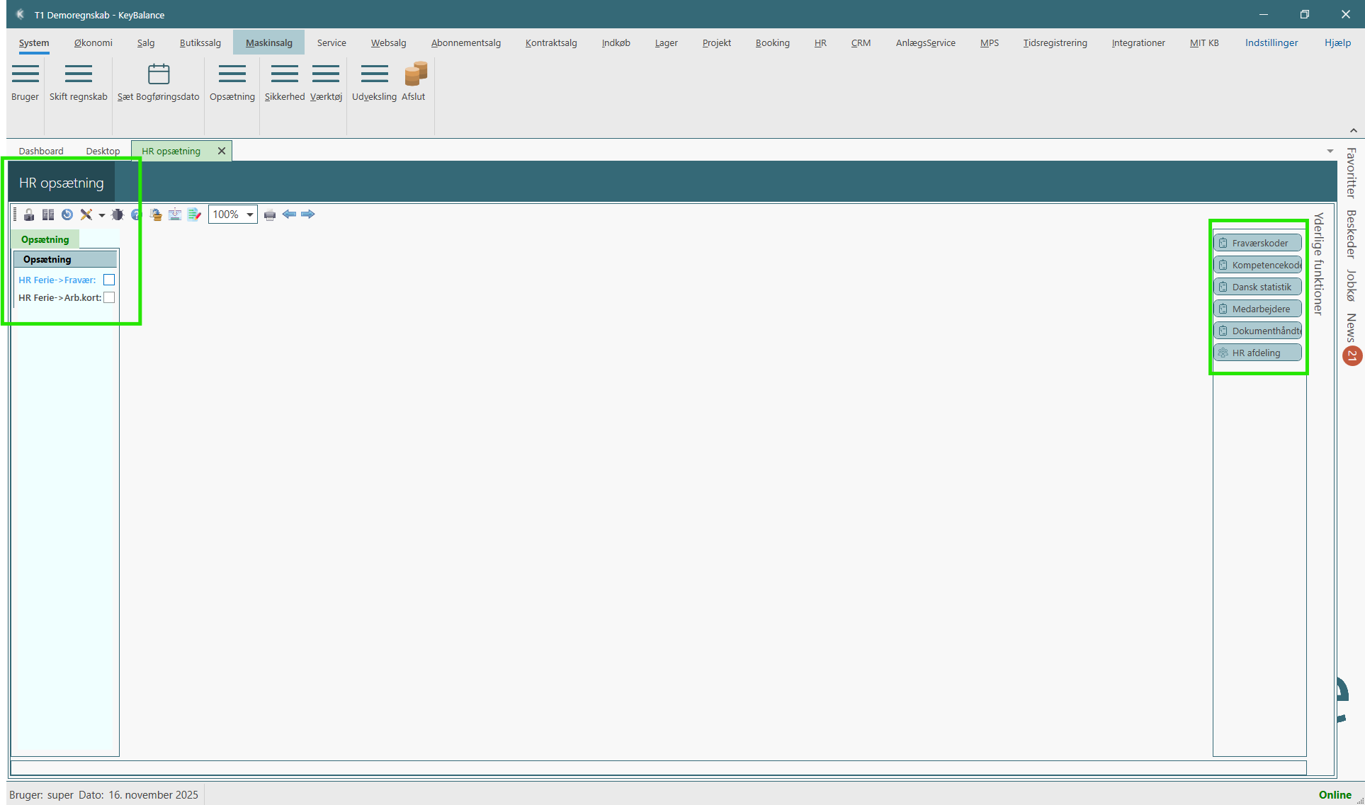 HR opsætningen styrer alle grundregler for HR-modulet: ferie, fravær, afdelinger, kompetencer, statistik og dokumenter. Den sikrer, at medarbejderdata behandles korrekt i hele systemet.