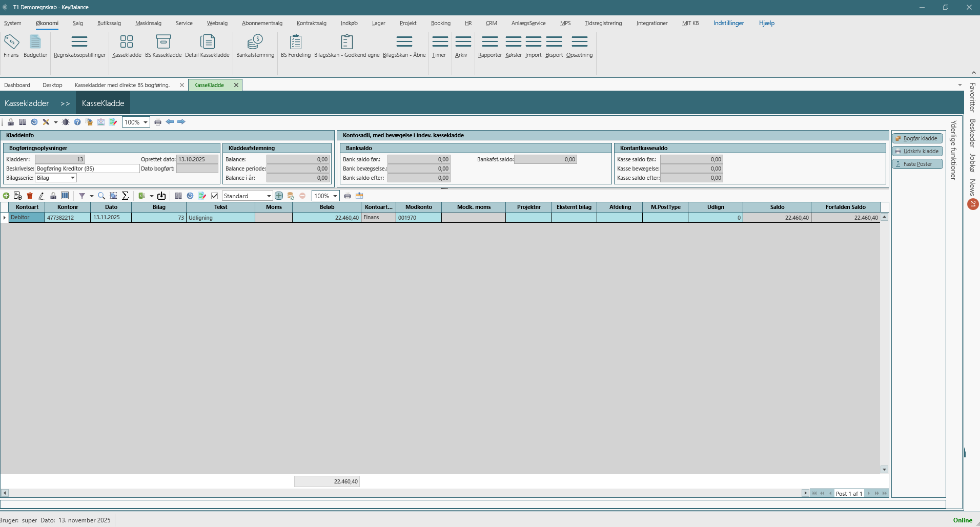 Her skal den samlede sum af kladden være 0 før bogføring.