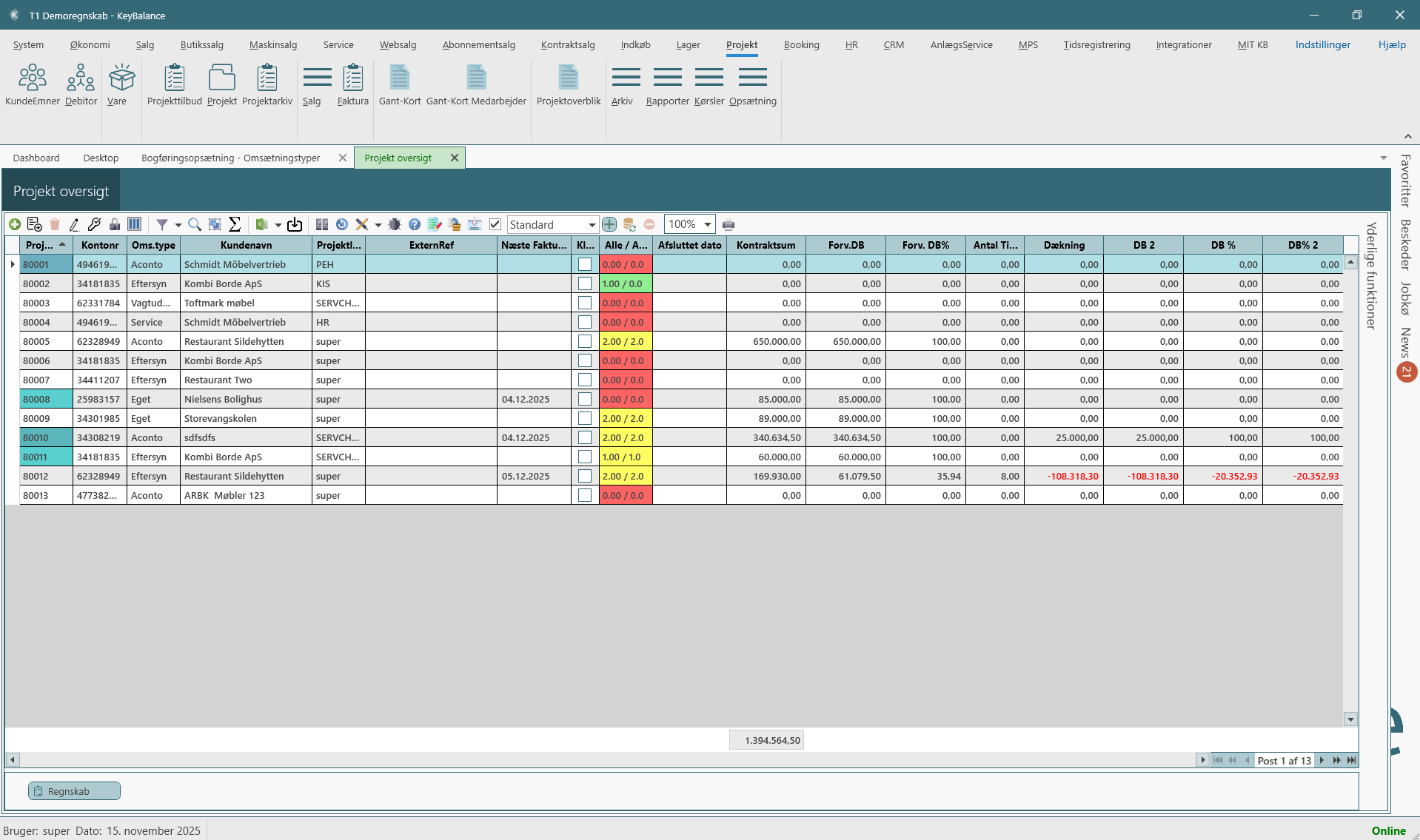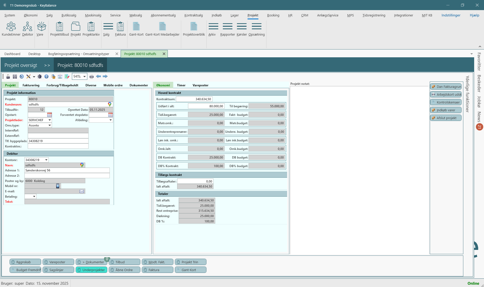 Fra projekttilbuddet klikker du på > Projekt. Systemet opretter projektet med alle varelinjer og beregnet kontraktsum og markerer tilbuddet som vundet.