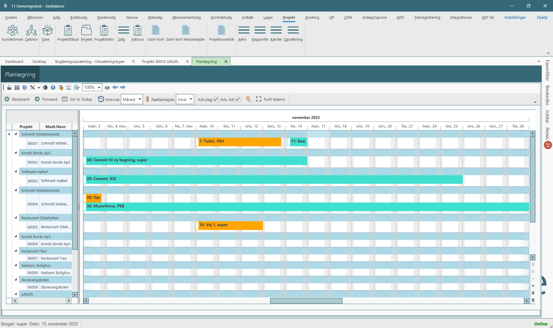 - Gantt-lignende tidslinjer pr. projekt og aktivitet