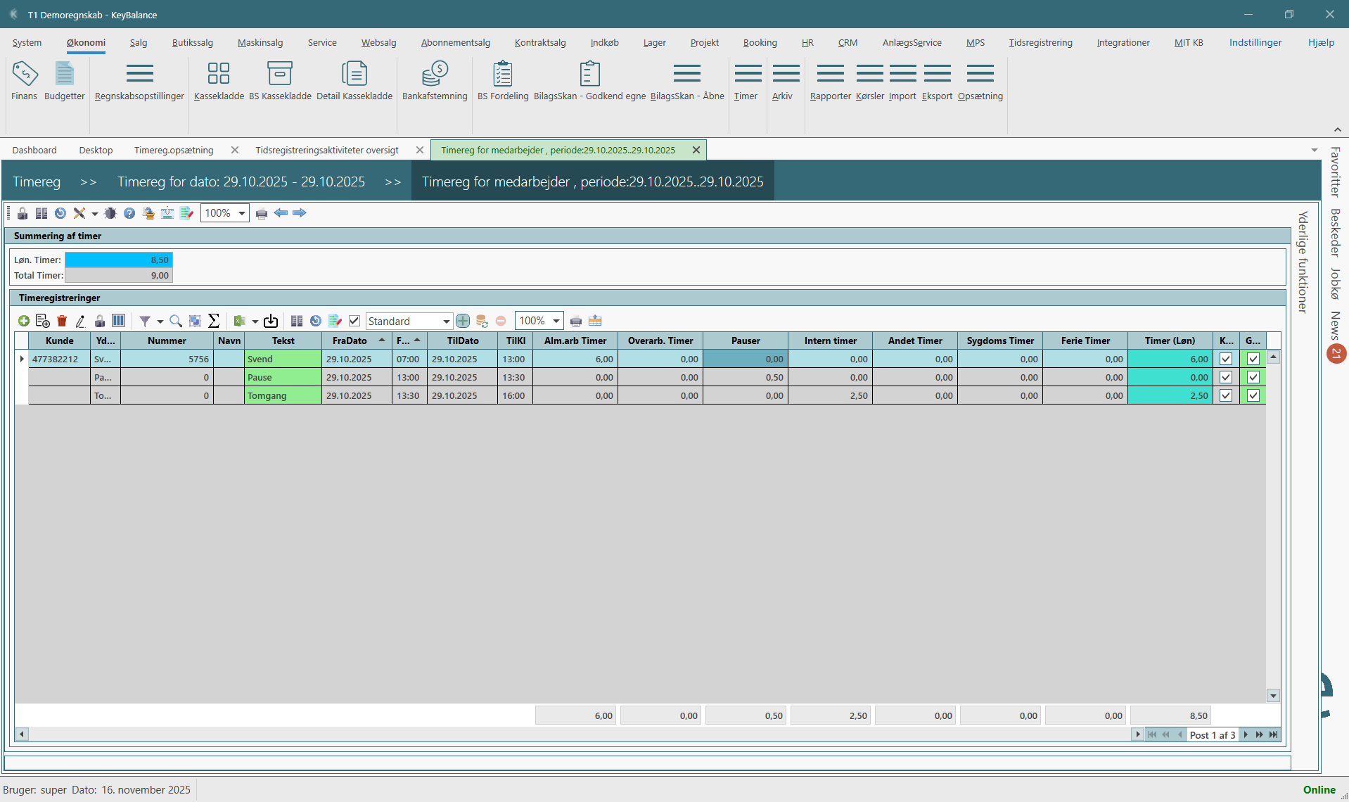 Systemet holder automatisk styr på tiden mellem hver registrering og gør det let at bruge timerne til fakturering, løn, projekter og opfølgning.