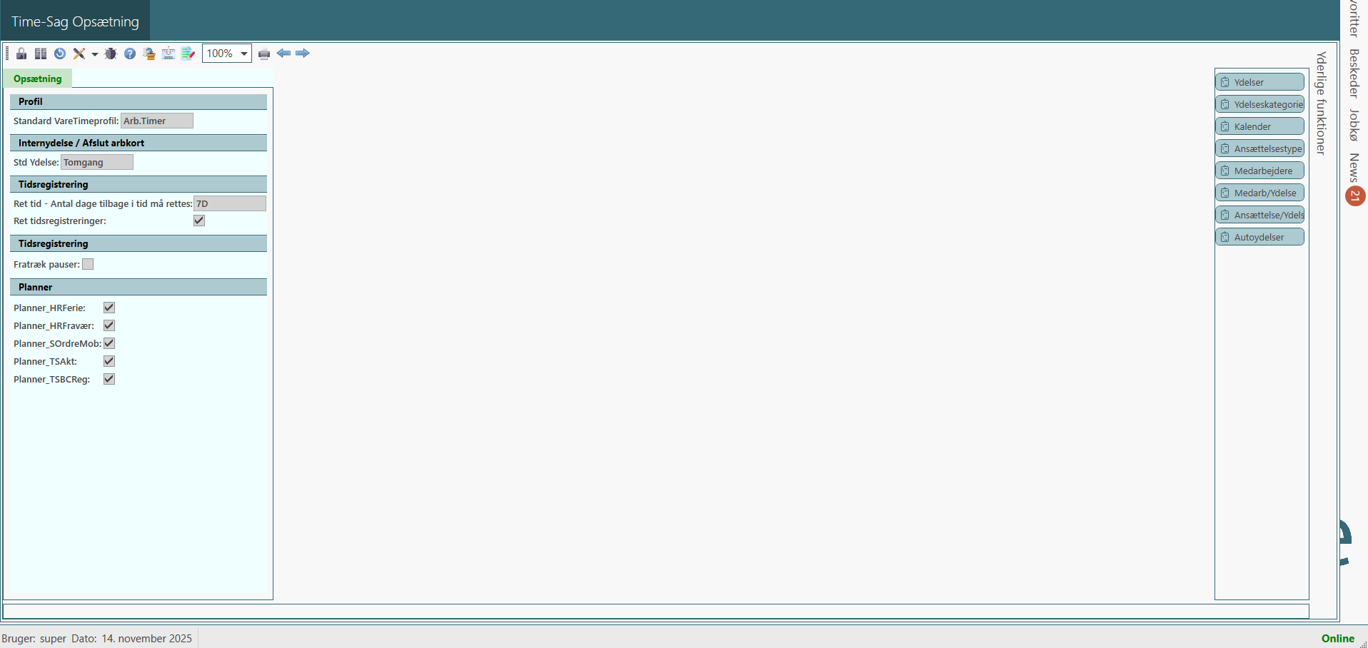 Time-Sag opsætningen er ”motoren” bag tidsregistrering. Her sætter du de overordnede regler.