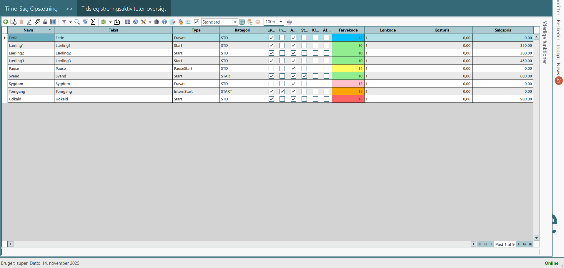 - hvordan hver aktivitet opfører sig ift. løn, faktura, fravær og statistik