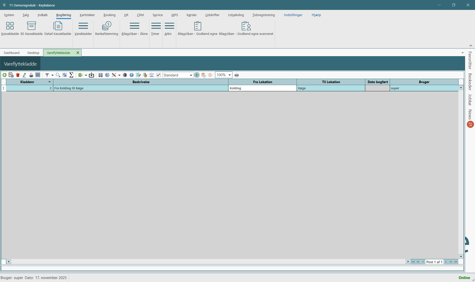 Under Vare → Bevægelse kan du se alle vareposter, inkl. interne flyt.