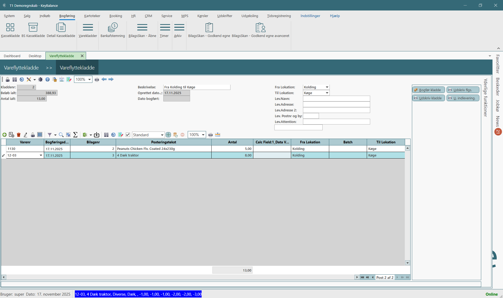 Hvis varen er batchstyret, udfylder KeyBalance automatisk batchnummeret, og både fra- og til-bevægelser registreres korrekt.
