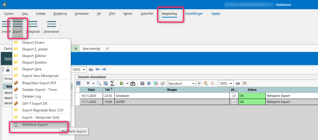 Under UDVEKSLING > EXPORT > Webparts kan ses en oversigt over alle afsendelser. Her vil de fremstå som rød eller grøn efter om der er mødt fejl.